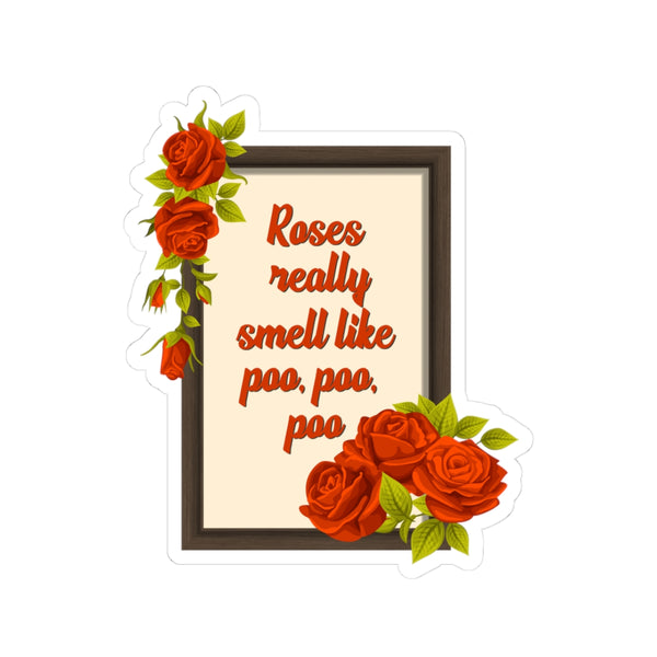 Bright, glossy kiss-cut stickers that blend vintage floral charm with offbeat humor. Each sticker shows a framed print of bold retro script surrounded by lush red roses and leaves — a cheeky, irreverent touch for laptops, journals, water bottles, or anywhere you want to add personality. The vibrant eco-solvent inks make the colors pop against the glossy finish, while the durable vinyl and strong permanent adhesive keep the design looking sharp on smooth, flat surfaces. Choose white or transparent backing and from four sizes to suit placement needs. Application is smooth and bubble-free, so adding a splash of attitude to your everyday gear is quick and satisfying.