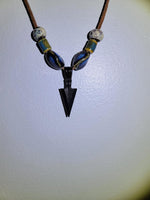 This handmade men's brown suede corded necklace features multiple styles of blue ceramic beads with a metal black arrowhead pendant in the center. Adjustable to fit most sizes.