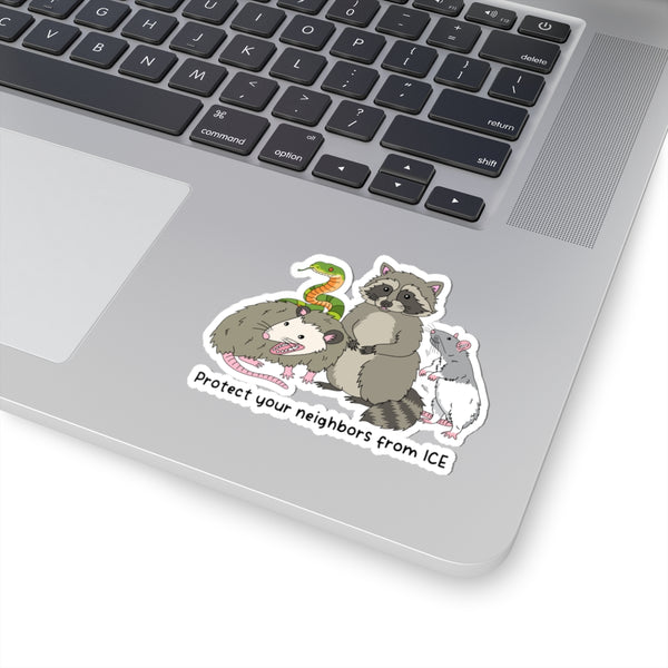 A cheeky, hand-drawn sticker featuring a brave crew of neighborhood wildlife — a raccoon, opossum, rat, and a little snake — standing together beneath the caption “Protect your neighbors from ICE.” The glossy kiss-cut vinyl brings out the soft, muted palette and fine linework, making every whisker and wary eye pop. It sticks smoothly to laptops, journals, water-resistant tumblers (indoor use recommended), and window panes, adding a small, subversive token of solidarity to your everyday gear. Place it where friends will see it and nod; it’s a quiet, clever way to show you look out for the vulnerable and value community care. Featuring art by BestiePattern on Etsy!